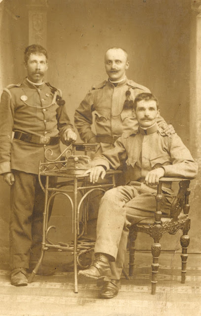 Še eno vprašanje, prilagam fotografijo pradedka (mož v sredini), ali bi mi kdo lahko kaj več razbral iz fotografije (ali gre za čas pred ali med WWI, kateremu rodu pripadajo uniforme, kaj pomenijo trakovi na prsih itd????)